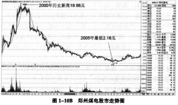 2000年6月,郑州煤电创出自上市以来最高价格,达到18.32元,成交量也放出历史新高。接下来的7月、8月,股价接连创出新高,但是成交量却没有创出新高,并且还出现了明显的缩量趋势。以此判断,股价见顶。