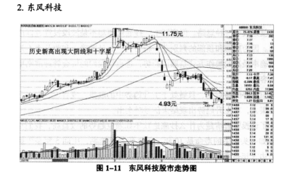 2007年5月8日,当时,股市人气达到高潮,国家出台的一系列防过热调控政策几乎都失灵。在这种情况下,东风科技创历史新高11.75元,但却是从涨停位置来了一个泰山压项,当日收一根巨阴线,换手高达17%,次日收十字星,换手11%。