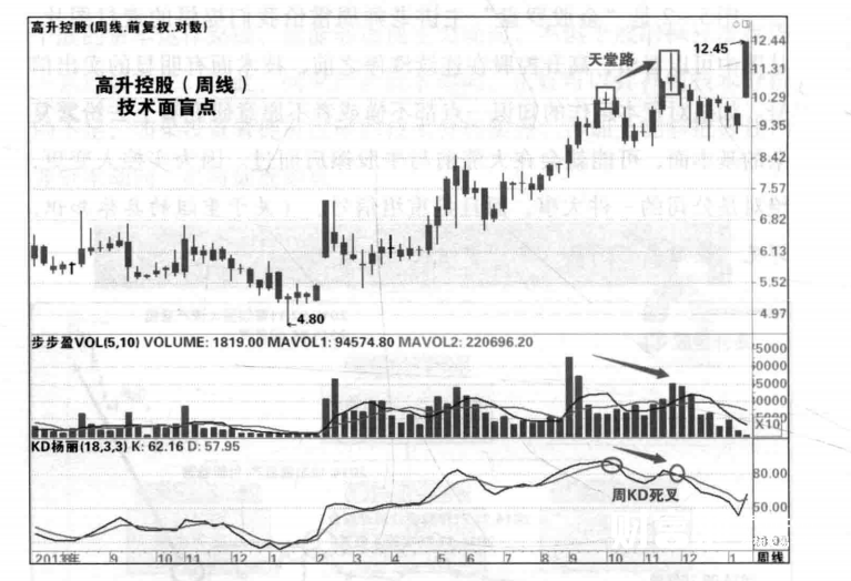 如图5-3所示,高升控股(000971)在2014年11月28日那周,周K线收天堂路,股价上涨过程中,成交量明显跟不上,形成量价背离;同时周KD指标与股价形成背离死叉,看上去是不错的卖点。