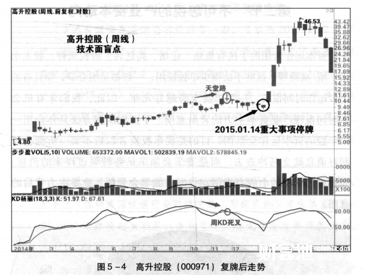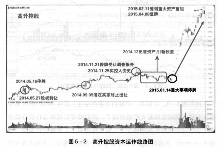 回看图5-2,中间有一句特别重要的标注:2014年11月25日实控人变更,这就是后面大涨的起因了,我们就可以理解为什么在技术面见顶信号出现后的不到两个月,该股就停牌了。复牌后的走势,如图5-4所示。正是因为资本运作常常使个股违反常态,无视大盘与技术回调要求,逆势大涨,所以才值得我们深入研究。