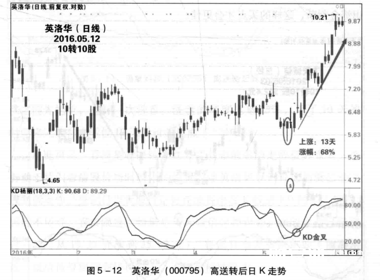 从图中可以看出,该股在股权登记日之前5天的时间里就回调了25%,在5月12日股权登记日当天低开高走,日K线收火箭升空,同时日KD指标金叉。后面仅13天的时间,股价就上涨了68%。