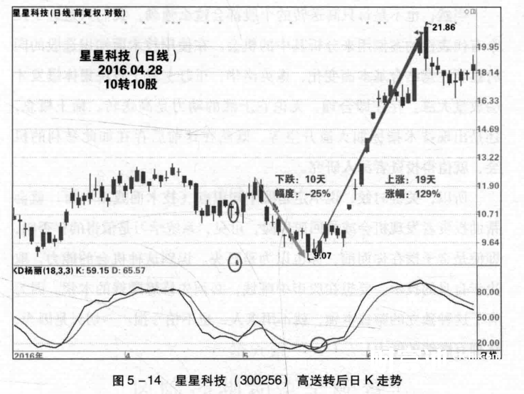 如图5-14所示,星星科技(300256)的年度分红方式为10转10,2016年4月28日为股权登记日。之后的走势有点像飞天诚信,大涨之前先挖坑,进行一次洗盘。洗盘的幅度也是25%,用了10天的时间来完成。之后仅19天股价就上涨了129% !