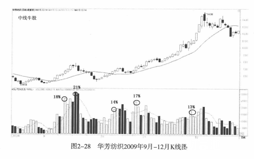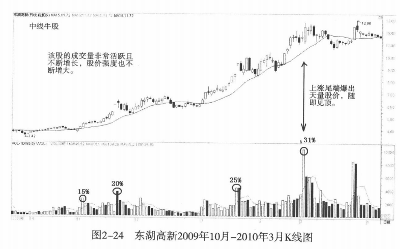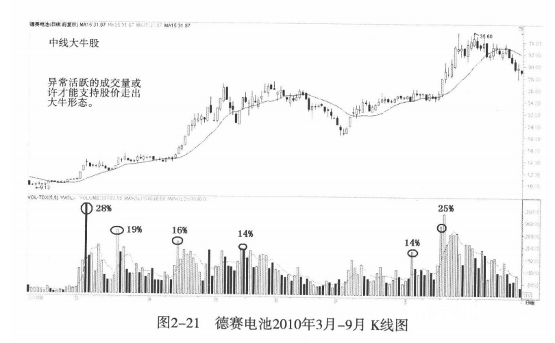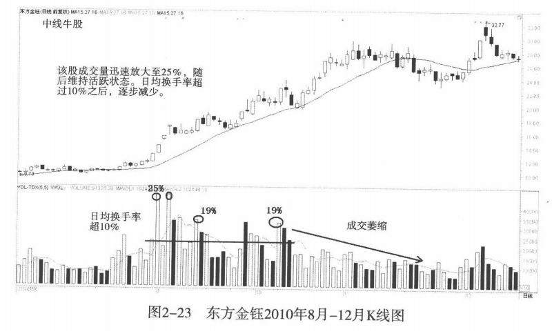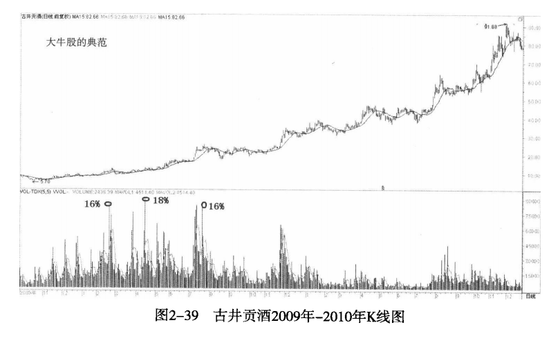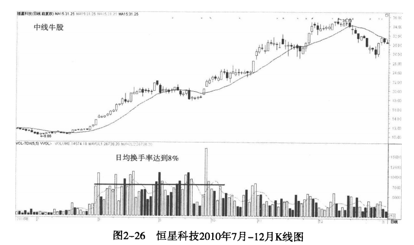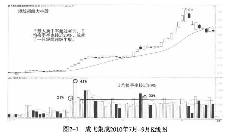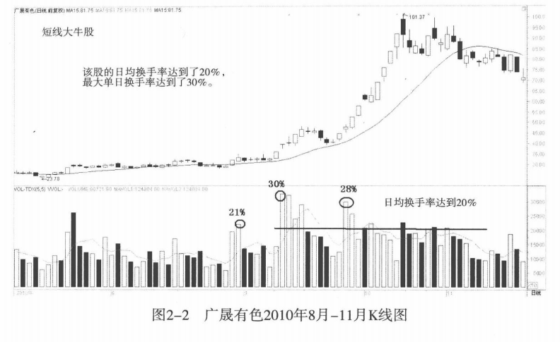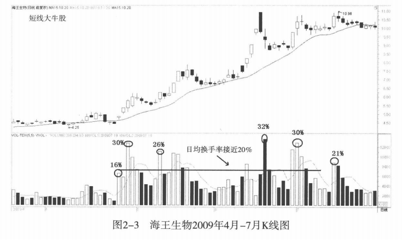 对于那些中短线极具爆发力的大牛股来说,换手率是十分惊人的,成交是非常频繁的。市场主动吸收了那些套牢盘、获利盘。