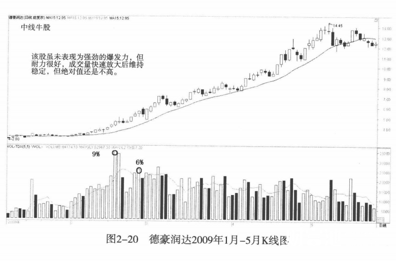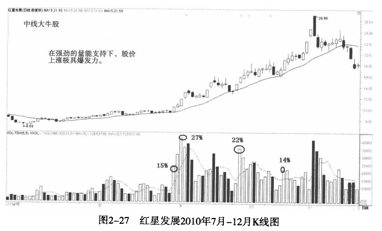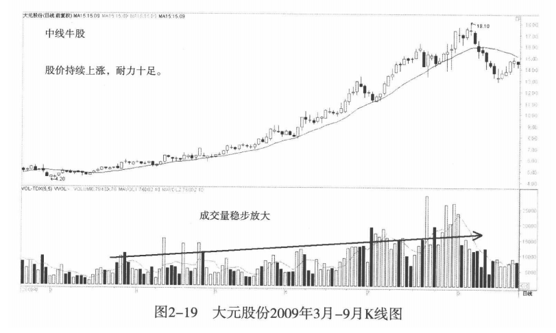 二、中线即大波段强劲上涨的牛股其对应的成交量变化
