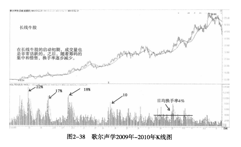 长线牛股所对应的成交量则会小一些,但在长线牛股的启动初期,量能也是足够充沛的。随着筹码的集中和惜售,换手率逐步减少,最后,流通盘的大小也会影响到换手的规模。盘子越大,其换手相对会小一些。
