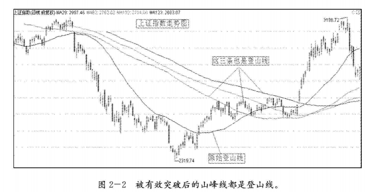 股价有效突破原始登山线后,凡是从下降趋势中延续过来的,没有经过谷底点与峰顶点的均价线都不是登山线。这些线不能构成强支撑或强压力,只是心理层面上的压力,所以目前市场上流行的普通均价线不在本文研究的范畴。如图2—4,除标明原始登山线外的其他均线都没意义。