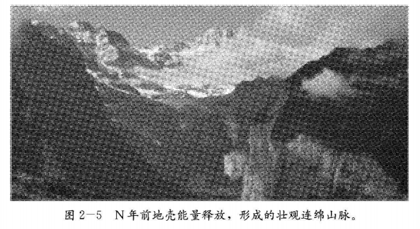 2.从自然山峰形成的客观角度分析,地壳能量经过长时间的累积,爆发后形成一道道连绵上升的山脉。如图2—5。