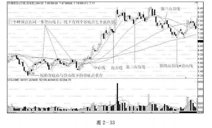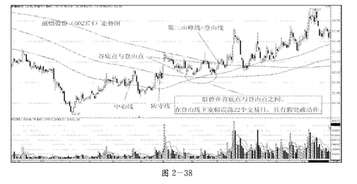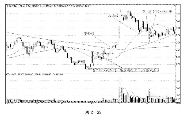 3.股价每次上涨到登山线处就止涨启跌,且股价反抽登山线的次数不低于两次。