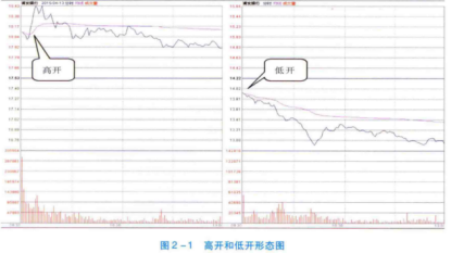 分时图中间有一条直线,代表的是股票上个交易日的收盘价格。如果某个交易日的分时线起点在这条直线的上方,就说明当日开盘价高于前日收盘价,也就是高开;如果某个交易日的分时线起点在这条直线的下方,就说明当日开盘价低于前日收盘价,也就是低开。这两种形态如图2-1所示。