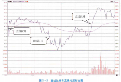 如果股价的上涨速度很快,在几分钟内连续上涨多个百分点,在分时图上形成一条几乎竖起来的直线,就称为直线拉升。相反,如果股价的下跌速度很快,在几分钟内连续下跌多个百分点,在分时图上形成一条几乎竖起来的直线,就称为直线打压。这两种形态如图2-2所示。
