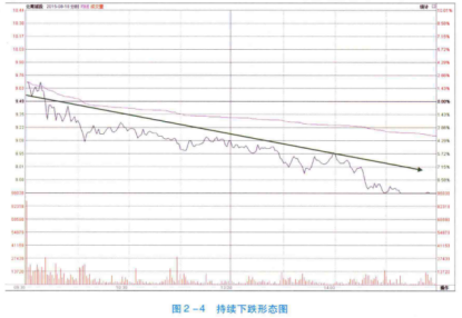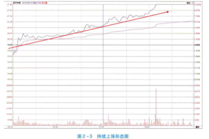 在部分不严格的说法中,只要股价不断上涨,并且每次回落的低点越来越高,就称为持续上涨。如果股价不断下跌,并且每次反弹的高点越来越低,就称为持续下跌。这两种形态如图2-3和图2-4所示。