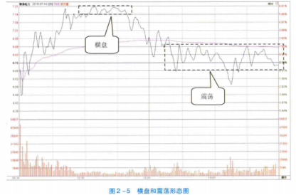 如果分时图没有形成明显的上涨或者下跌走势,而是在一个价格区间内反复波动,就形成了横盘或者震荡的行情。如果这个价格区间比较小,这种波动就称为横盘;如果这个价格区间比较大,这种波动就称为震荡。这两种形态如图2-5所示。