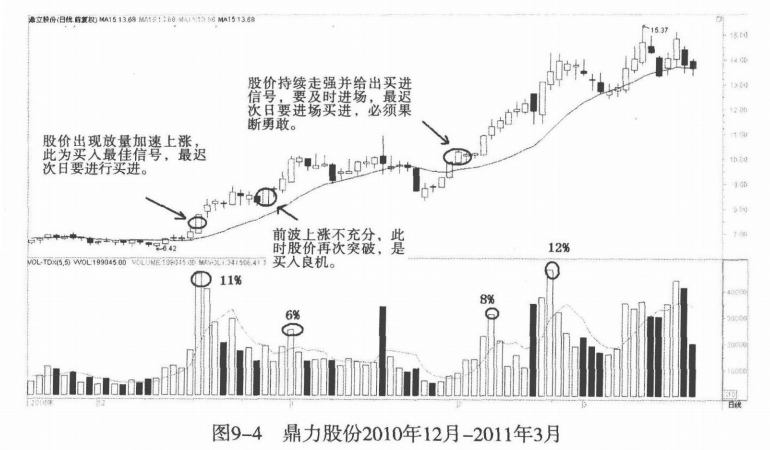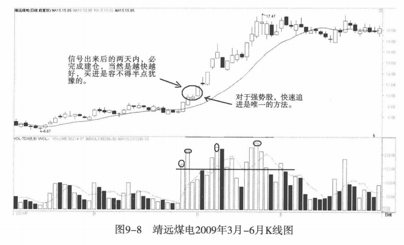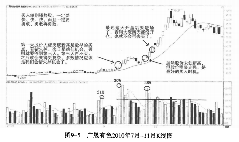 如果还没有买到,在第四根阳线就没必要追涨,除非出现两三天左右的小幅震荡,然后股价再起的话,我们或许还能进场买进。不过,之后的加码操作似乎没办法完成,操作的周期也就变成明显的短线了。
