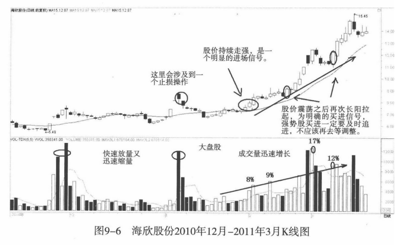 最后一部分内容就是要最大可能地实现单笔交易的大赚。要实现大赚,除了选对个股之外,还需要加码买进,确保手中有足够的筹码。此外,还需要一个耐心持有的过程,耐心持有到相应趋势的走弱甚至结束。面对微小的利润,我们则不予理会,除非股价已无再次上涨的可能了。只有不去在乎小利润,才能保证大利润的实现。