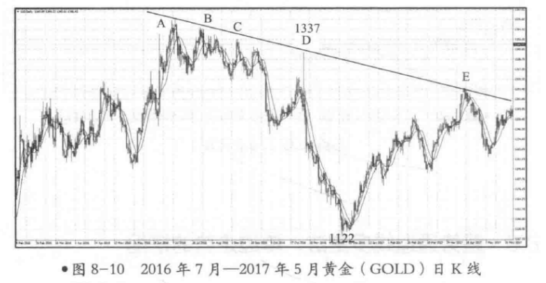 实战分析:如图8-10所示,2016年7月—2017年5月,这一轮行情当中,走势非常标准地延续了趋势线的阻力形成了回落的行情,当A、B点确立之后,C、D、E三个点都是在趋势线的延伸线上形成了延续,而且级别都不小,最大的一次是D点,即美国总统大选的时候,黄金价格走势自1337美元/盎司跌至1122.美元/盎司的位置,跌幅为215美元/盎司。
