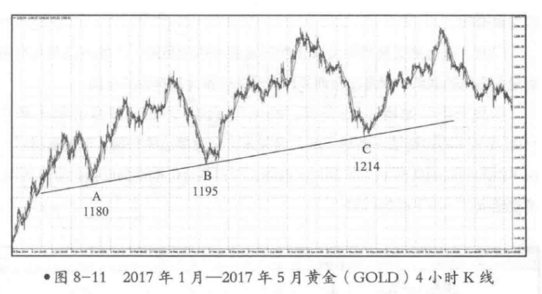 实战分析:如图8-11所示,2017年1月—2017年5月期间,黄金价格走势在持续性的台阶式震荡上升行情当中,当走势首次在A点1180美元/盎司以及B点1195美元/盎司形成低点之后,走势从B点出现了强势上升,上升回踩的C点位置就是A、B两点形成的趋势线支撑位置,随后再次推动了黄金价格走势的上升。