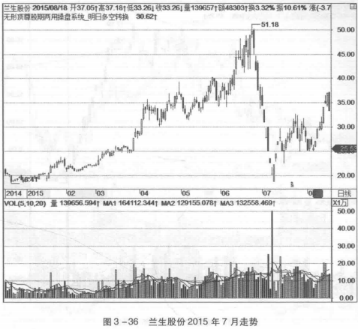 在图3-36中,兰生股份在2015年7月随指数的见顶形成大幅回落的走势,半个月的时间吞掉近半年的整体涨幅,自2015 年初介入的资金如果一直持股的话,到了7月初的时候,资金无一生还全部被套。其实对于做超跌个股来讲,这种下跌幅度大的个股反而是最佳的交易对象。