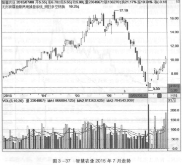 在图3-37中,智慧农业在2015年7月下跌之前,股价于高位横盘的周期较长,结合后期的下跌走势来看,庄家的资金完全有时间在高位进行出货操作。资金跑了,而后股价又随着指数同步大幅下跌也就是很正常的波动。在半个月的时间里,股价便从16元左右滑到了6元左右技术上具备了反弹各项要素。