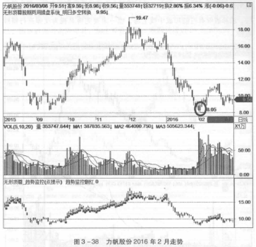 在图3-38中,力帆股份在2016年2月股价下跌之前高位有过震荡,这种走势留给机构足够的出货机会,而后的下跌过程中成交量一直保持菱缩的状态,这说明机构资金早就在高点完成了出货的操作。