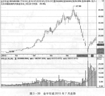 在图3-39中,金宇车城2015年7月,随着指数出现同步下跌的走势,从股价上涨到高位时的成交量来看,机构资金出货的效果应当是不太好的,因为股价高位并没有明显的放量现象,故此可以推断,下跌出现之