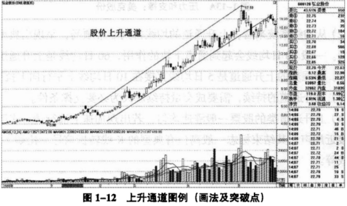 上升趋势中最典型的走势是上升通道。上升通道指的是,股价形成上升趋势后,其各波段最高点连线和各波段最低点连线构成两条向上倾斜的平行线。股价就在两条平行线构成的通道内震荡上涨。这个通道就是上升通道。