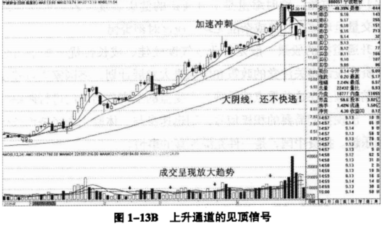 (4)上升通道类的股票一般涨速均匀,若出现加速上涨行情,表明上升通道接近尾声。其结束标志一般高位有典型的K线转折信号,比如十字星,大阴线等。