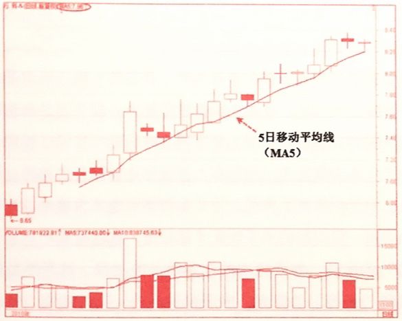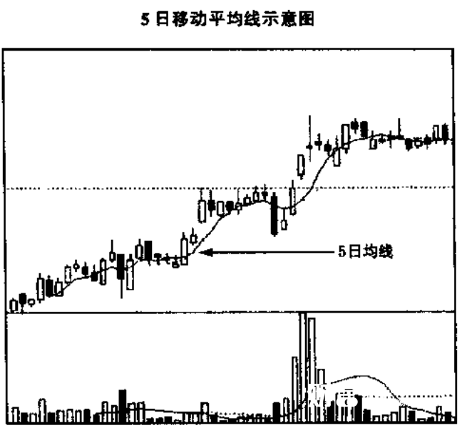 所谓移动平均线,是指一定交易时间内(日、周、月、年)的算术平均线。以5日均线为例,将5日内的收盘价逐日相加,然后除以5,得出5日的平均值,再将这些平均值在图纸上依先后次序连起来,这条绘出的线就叫5日移动平均线。如果要绘制10日移动平均线,只要将上面“5”这个数字,换成“10"即可。其他30日、60 日.120日……移动平均线的画法可以此类推。
