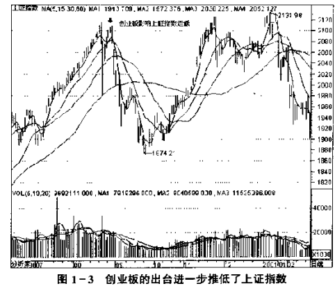 上证综指在2000年8、9月份的下跌,与深交所将要开设创业板直接相关。8月份时,深交所在中国证监会的授意下,计划于2000年11月份开始进行二板市场拟上市公司的募股工作,这便动摇了人们对主板市场的信心。虽然这与监管机构推出二板市场的愿望相背离,但市场对此的反应自有其道埋。