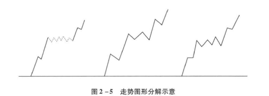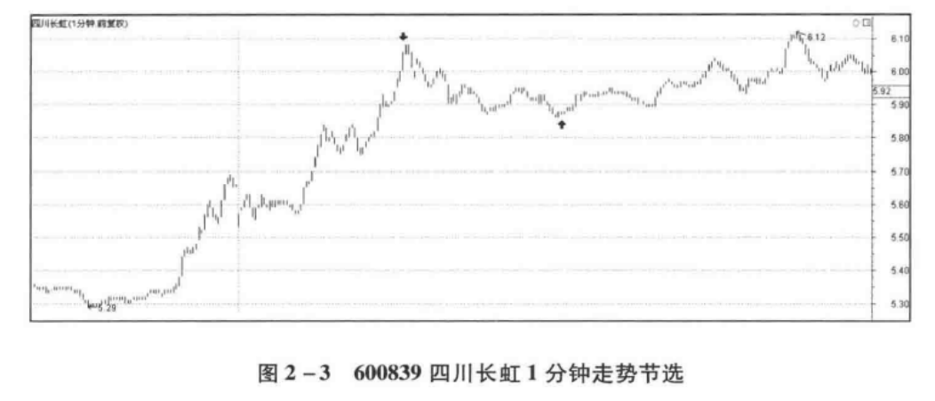 图2-3中,向下箭头与向上箭头将走势分为三段,每段都是1分钟走势类型,图中是明显的上下上,构成5分钟盘整走势类型,中枢区间就是上下箭头之间。