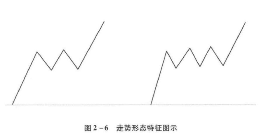 图2-6的两种形式是最基本的形态,每一段都是5分钟走势类型,在中间盘整的同时形成30分钟中枢。第一个图形是基本形态,第二个图形是中枢的延伸但没有扩大级别。当走势段延伸到9段,该中枢与走势的级别就扩大了,中枢的各种形态后文会单独分析,属于中枢形态部分。这里介绍基本理论,只用最标准的图为例