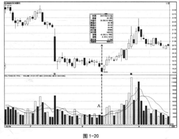 如图1-20所示,该股为小盘股,该股经过下跌后,在盘整阶段的A点换手率为2.59%。该股流通股本不足1亿股,这个换手率可算是该股成交量接近地量水平的表现。