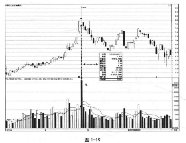 如图1-19所示,该股为蓝筹权重股,流通股本为956亿股,A点为股价高位,当时的换手率为2.76%,这个换手率已经处于其历史高值区域,可谓是该股的天量。之后,股价由此发生趋势向下转折。