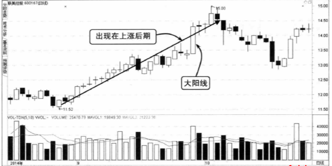 上影阳线是一种带上影线的阳线形态。要想理解上影阳线所蕴涵的市场含义,我们应首先了解上影阳线的形成过程:个股当日开盘后,多方力量占据一定优势,随后,多方于开盘后或盘中发动攻击,但当股价上冲到某一高位后,遭遇到了空方强大的抛压,使股价上升受阻,并出现了一定幅度的回调,但在收盘时的收盘价仍然要高于开盘价,因此形成了一个带上影线的阳线实体。由于当日以阳线形态报收,故在多空双方的总体交锋中,多方占据一定优势,但长长的上影线也说明个股的空方抛压不小,预示着个股随后的上涨走势不容乐观。在利用上影阳线进行实盘操作时,我们还要结合个股的整体走势来做综合分析。