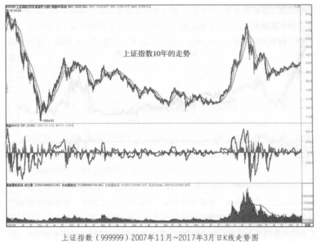下面第一幅图是中国石油从2007年上市到2017年10年间的日K线走势图和对应时间上证指数的走势图,虽然两者的走势各有特色,但是有着一个最大的共性:从2007年年尾进入下跌,衰败的时间长达8年。在2015年的牛市末期,上证指数整体上涨幅度和8年前的高点只差1000点,距离不足20%,但是中国石油距离8年前的高点还有30元的差距,相差200%的空间。