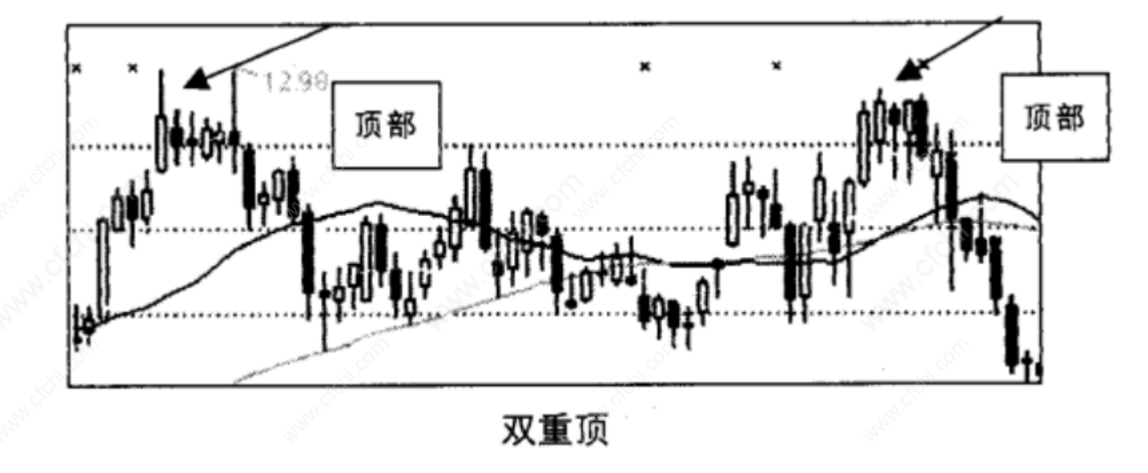 双重顶,顾名思义就是股价先后两次形成差不多价位的高价,从K线上看就像两个并列的山头。从图形上可看出,非常类似英文字母“M”,故双重顶又可称“M”头。