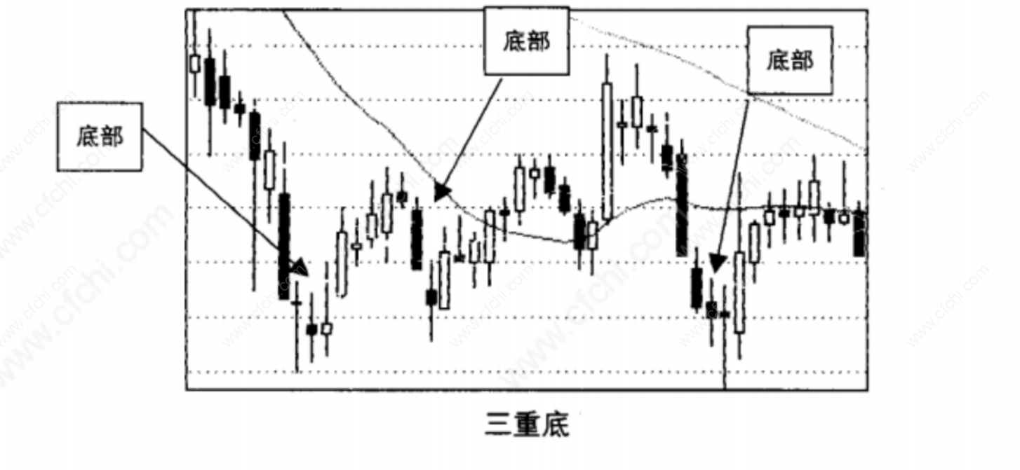 三重底可以说是三重顶形态的倒影,在K线图中可以由三个底点形成。