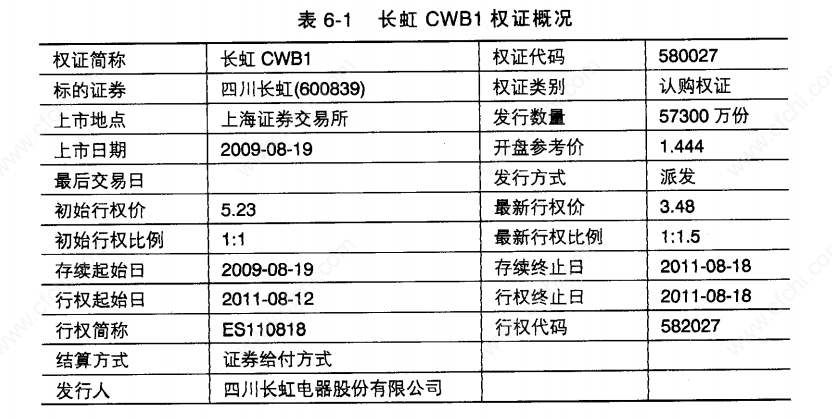 从表6-1中,可以看到长虹权证初始行权为5.23元,而最新行权价为3.48,说明行权价随着正股的股价波动在随时调整。