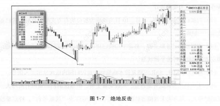 目标股股价经过大幅下跌,量能处于极度萎缩状态,突然某一天,股价跳空低开或平开,然后快速上攻,收盘价等于或接近全天最高价,形成一根低开高走或平开高走的大阳线,这是股价短线见底的重要标志,亦是进场的好机会,我们把这根低开高走的放量大阳线称为“绝地反击”(图1-7)。