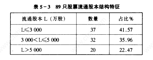 从股本结构特征来看,89只股票中以小盘股占比最大。89只股票股本结构的基本特征是:总股本不足2亿股的股票占比为88.77%,流通股本小于或等于5 000万股的股票占比为77.53%,股本结构中有B股和H股的股票占比分别为4.49%和1.12%,国家股和法人股持股比例普遍较低,全流通股公司(即“三无板块")中涨幅超过100%者达60%。89只股票的平均总股本为13727.67万股,平均流通股本为3 965.41万股,如表5-2、表5-3所示。.