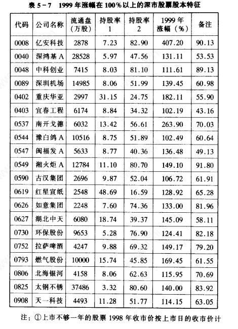 在1998年前后两波行情中,流通盘小,价格偏低和流通市值规模不大的小公司就是市场的佼佼者。在1998年度涨幅超过100%的股票(以基期1997年12月31日收盘价与年度最高收盘价的差幅计算)共89只,其中深市34只,沪市55只,分别占两市A股上市股票的8.54%和13%。其中,基期流通市值小于5亿元的股票占比达86.52%,流通市值不超过3亿元的股票共55只,占比达61 .8%。