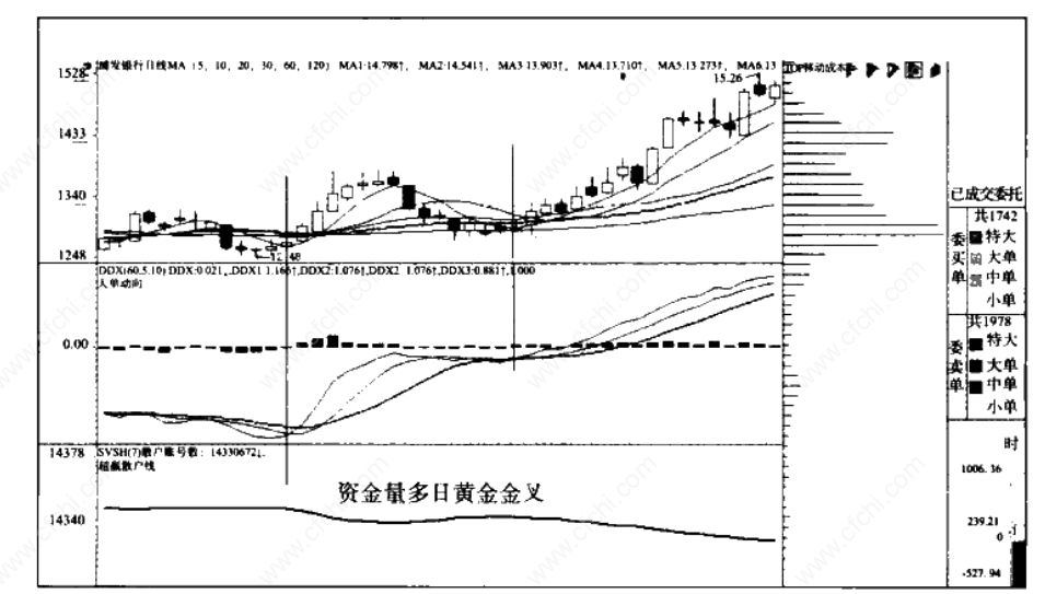 看到图形可能并不需要更多的解释,多日资金量的黄金交叉的优越性要优于均线的黄金交叉,或者说均线黄金交叉配合多日资金量交叉那是最佳拍档。
