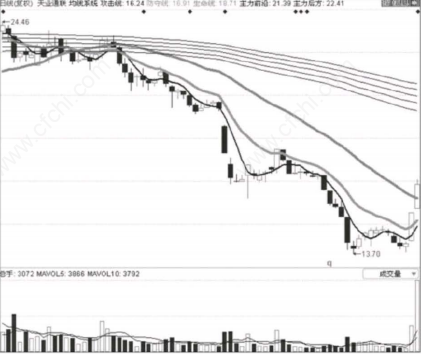 在一段下跌过程中,市场的短、中、长期均线是逐渐下降的,也即市场的平均价格在 逐渐降低,这样均线就对股价产生了压制作用,股价沿着平均成本的压力步步下跌。这就是趋势形成的原理。
