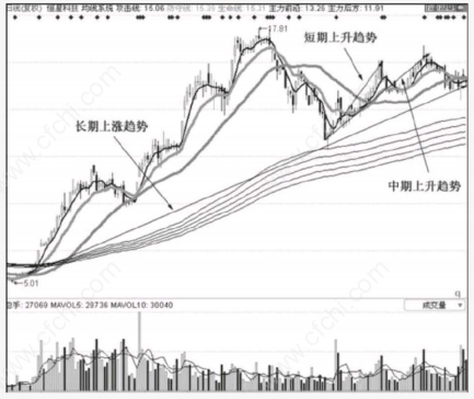 何为均线多头排列?均线多头排列是指短、中、长期均线呈上涨状态,并且按由短及长依次从上到下排列,我们称为多头排列。我们还是通过图形更直观地看一下,如图所示。