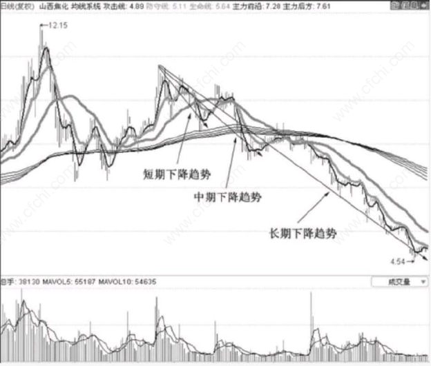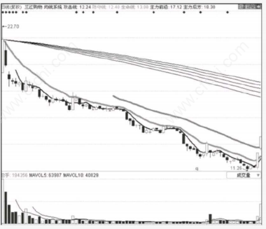 从图中可以看出,该股自上市之日起各均线都在下降过程中,并且从长、中、短期均线依次从上到下排列。短期均线跌势最强在最下层,其次是中期均线、长期均线,这是典型的所有均线都空头排列的例子。