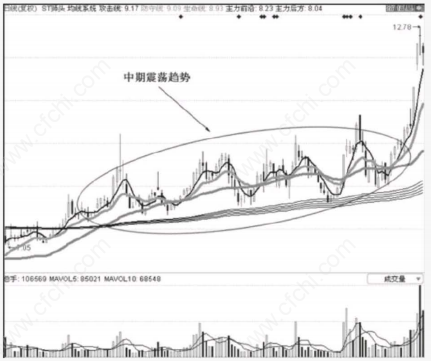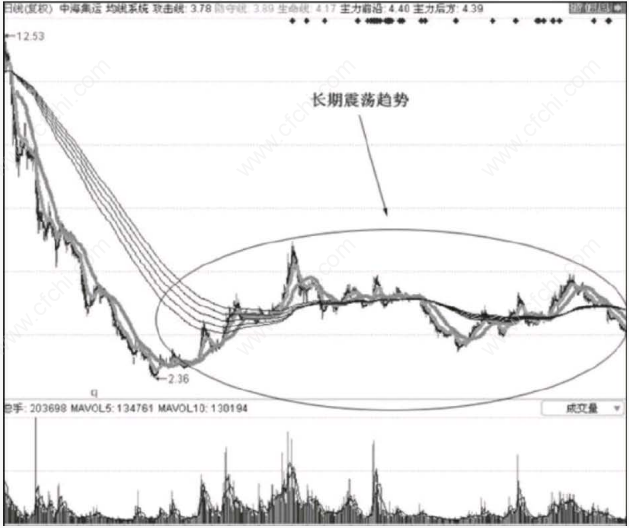 图就是典型的长期震荡趋势,它的短、中、长期均线交叉在一起,没有明显的长期上涨趋势,所以称为长期震荡趋势。