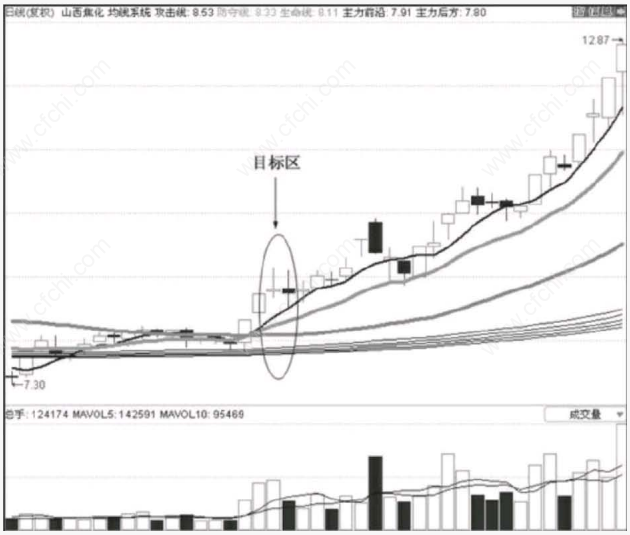 该股从图中标记的目标区域开始所有均线都呈上涨状态,并且攻击线>防守线>生命线>主力阵区,这是一个典型的所有均线都呈多头排列的例子,另外主力阵区本身也是一种多头排列。