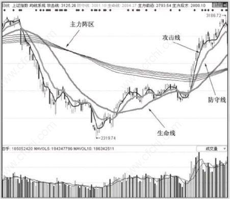 黄金均线“3+1”操盘系统的组成包括三线一区。三线分别是攻击线、防守线、生命线;一区即主力阵区。