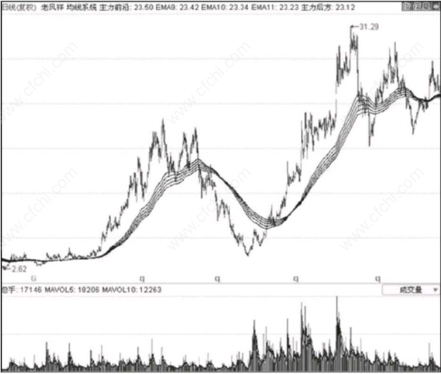 在均线“3+1”系统中,主力阵区的设置与其他三线不一样,三线是由简单移动平均线组成的,而主力阵区则用的是五条相邻的指数平滑移动均线组成的一条线带。在行情软件中的代码为: