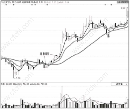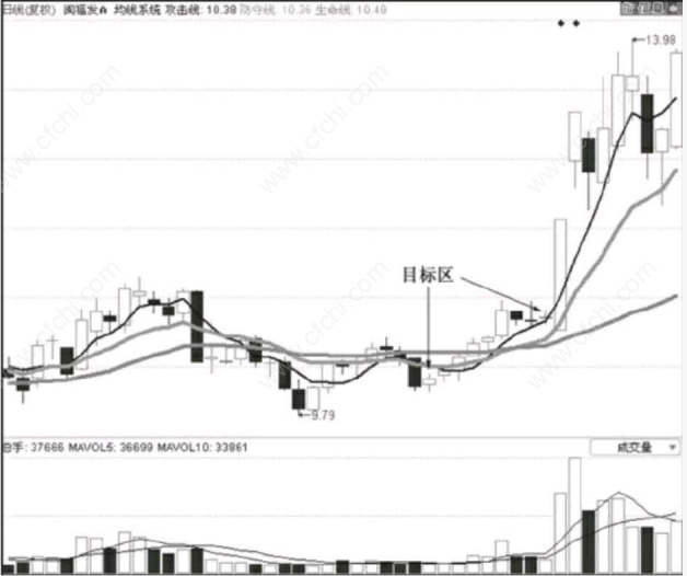 首先我们看均线,攻击线在防守线和生命线之上,呈现多头排列行情;其次股价从下跌转为上涨之后,从底部开始连续九个交易日中,收了八根小阳线,只有中间一根小阴线。这些小K线有一个共同的特点,就是都在沿攻击线上涨,收盘都收在攻击线以上。