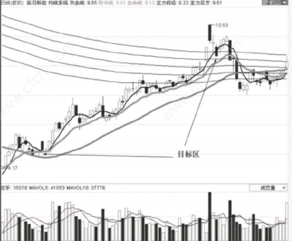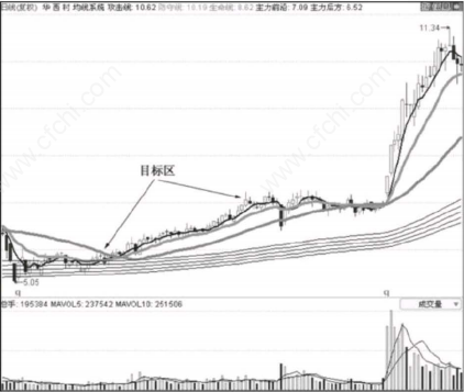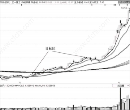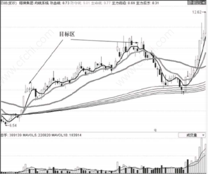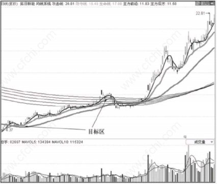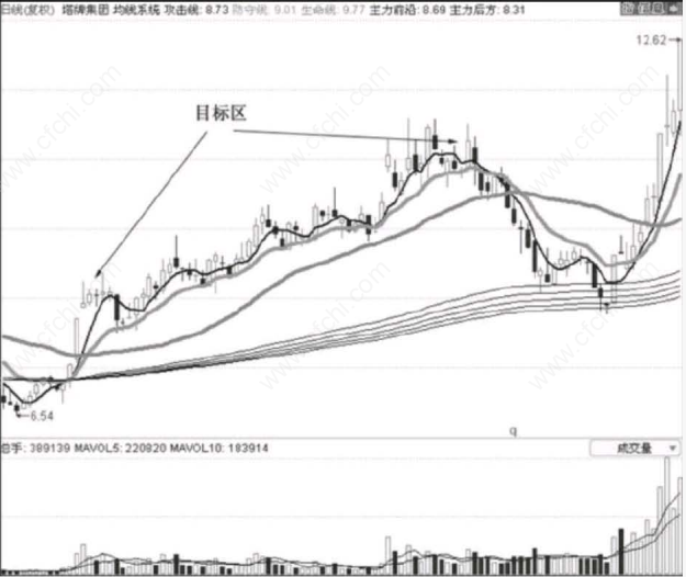 首先我们看图中目标区所在位置的均线已经全部多头排列,代表趋势为上涨趋势;